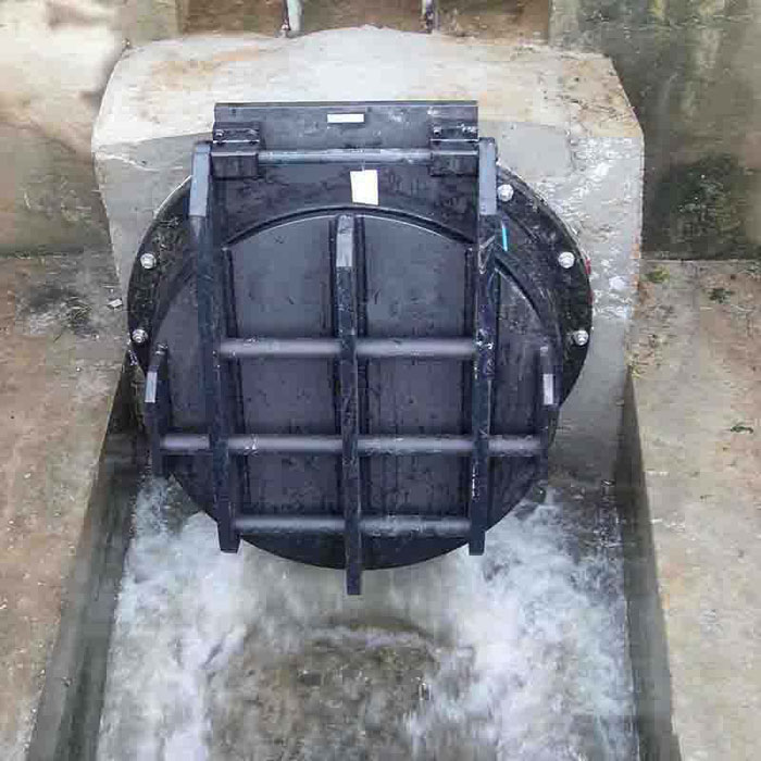拍门——主要安装在排水管道的尾端,用于防止外水倒灌。材质分为不锈钢、铸铁、型钢、复合材料(玻璃钢)等多种材料。而拍门又分为很多种,比如,浮箱式拍门,平板式拍门,套筒式拍门等等。